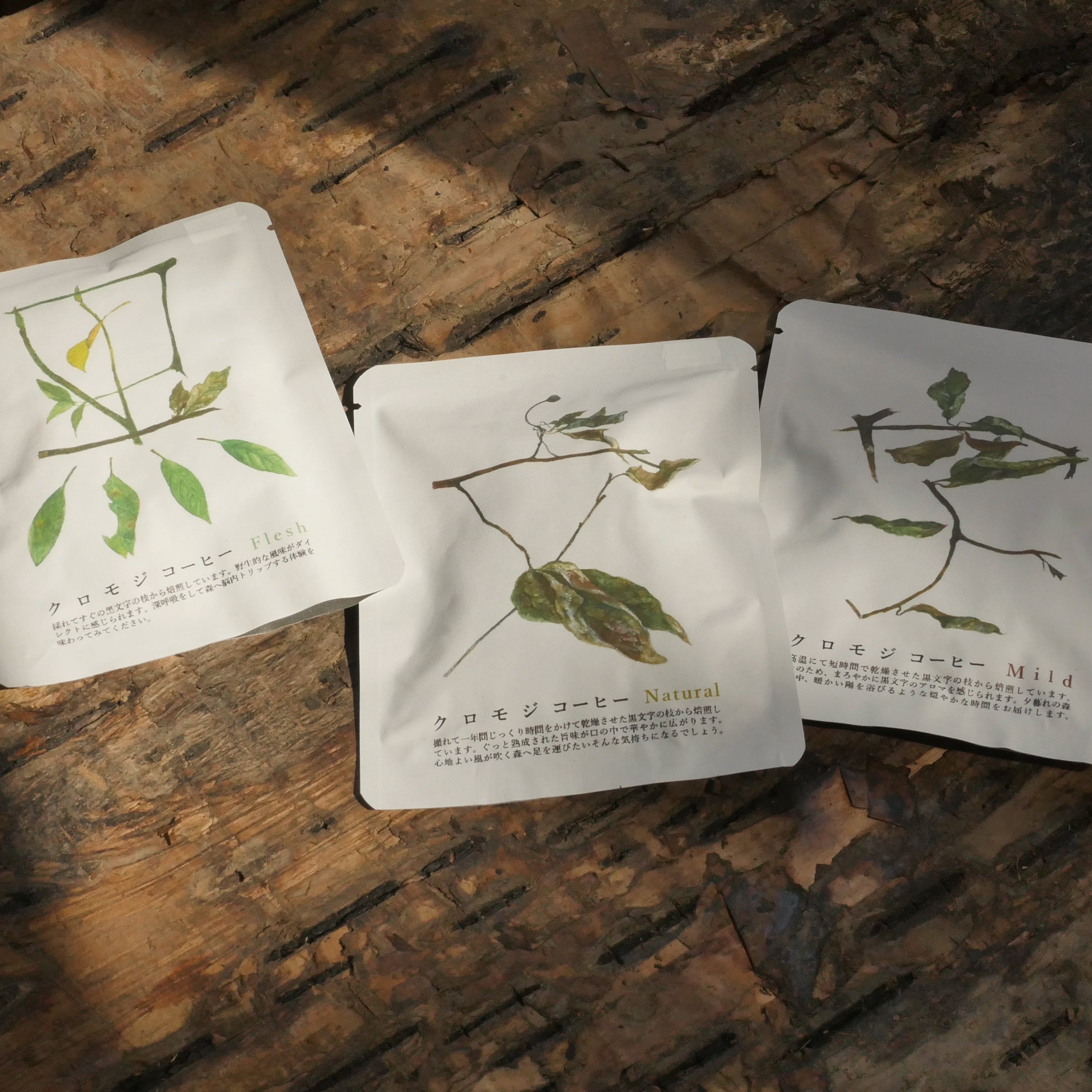 クロモジコーヒー Fresh(黒) / Natural (文)/ Mild(字) の3種類が1つずつ入ったセットとなっております。